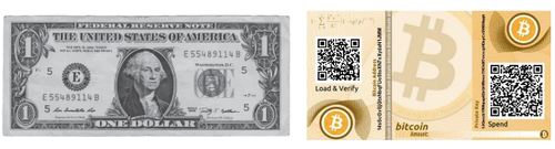 If you are not familiar with the concept of a paper wallet, the idea is that crypto users can create and print or load the all the information (address and private key) required to control some amount of Bitcoin on paper or a thumb drive. As a practical example of why you might do this, let’s say that you have some Bitcoin and you suspect the security of your exchange or computer or maybe you want to show some serious class and give your grandkids Bitcoin for the holidays, but – as we all know – giving someone something without actually physically giving someone something just isn’t the same. No problem, you create one uniquely-addressed paper wallet or drive for each “crypto-bill,” in whatever denominations you want; 1BTC, 3.1415BTC, 0.00002BTC, whatever. The two operations that we apply to bills and coins – authenticate and transact – work just as well with the crypto-bills, albeit differently. Someone can verify the amount in the wallet using only its address, analogous to looking at the denomination of the currency and checking that it’s not counterfeit. You can transfer the amount to them by handing over the private key (the recipient should transfer it to a different wallet they’ve always controlled ASAP of course).