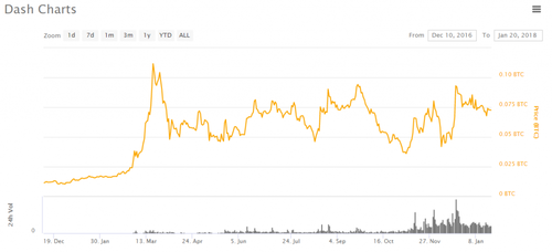 Chart of Dash, denominated in BTC. from coinmarketcap.com