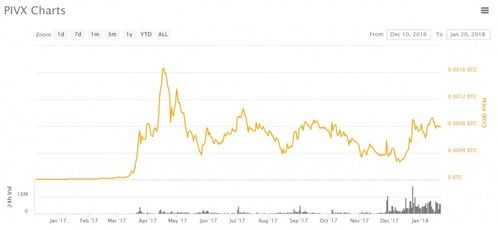 Chart of PIVX, denominated in BTC. from coinmarketcap.com